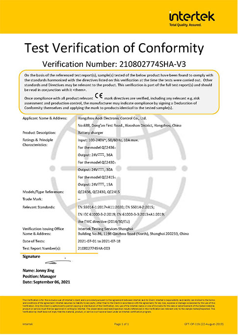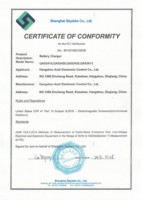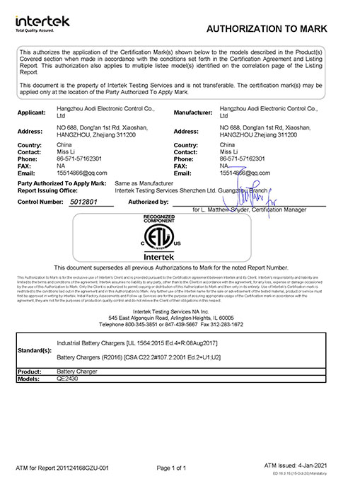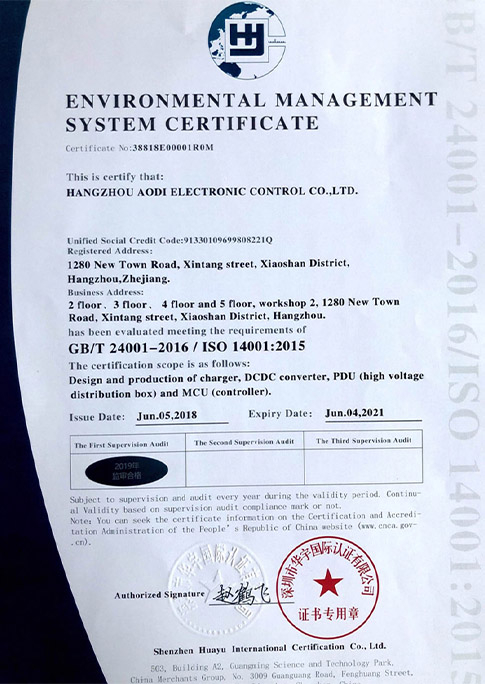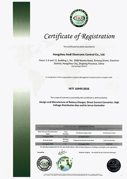 We, Hangzhou AODI Electronic Control Co.,Ltd.founded in January 2010,are an tier OEM and national high-tech enterprise that provides the charging system solutions for EV and Industrial Equipment(AWP, forklifts, golf carts, etc) 0ur company has passed lATF16949.IS014001,IS045001,GB/T29490-2013,IS017025 and our Battery Chargers certified by CE,ETL,CEC,CB,KC etc